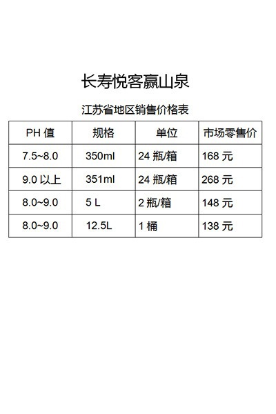 長壽悅客贏山泉 江蘇省地區(qū)銷售價格表